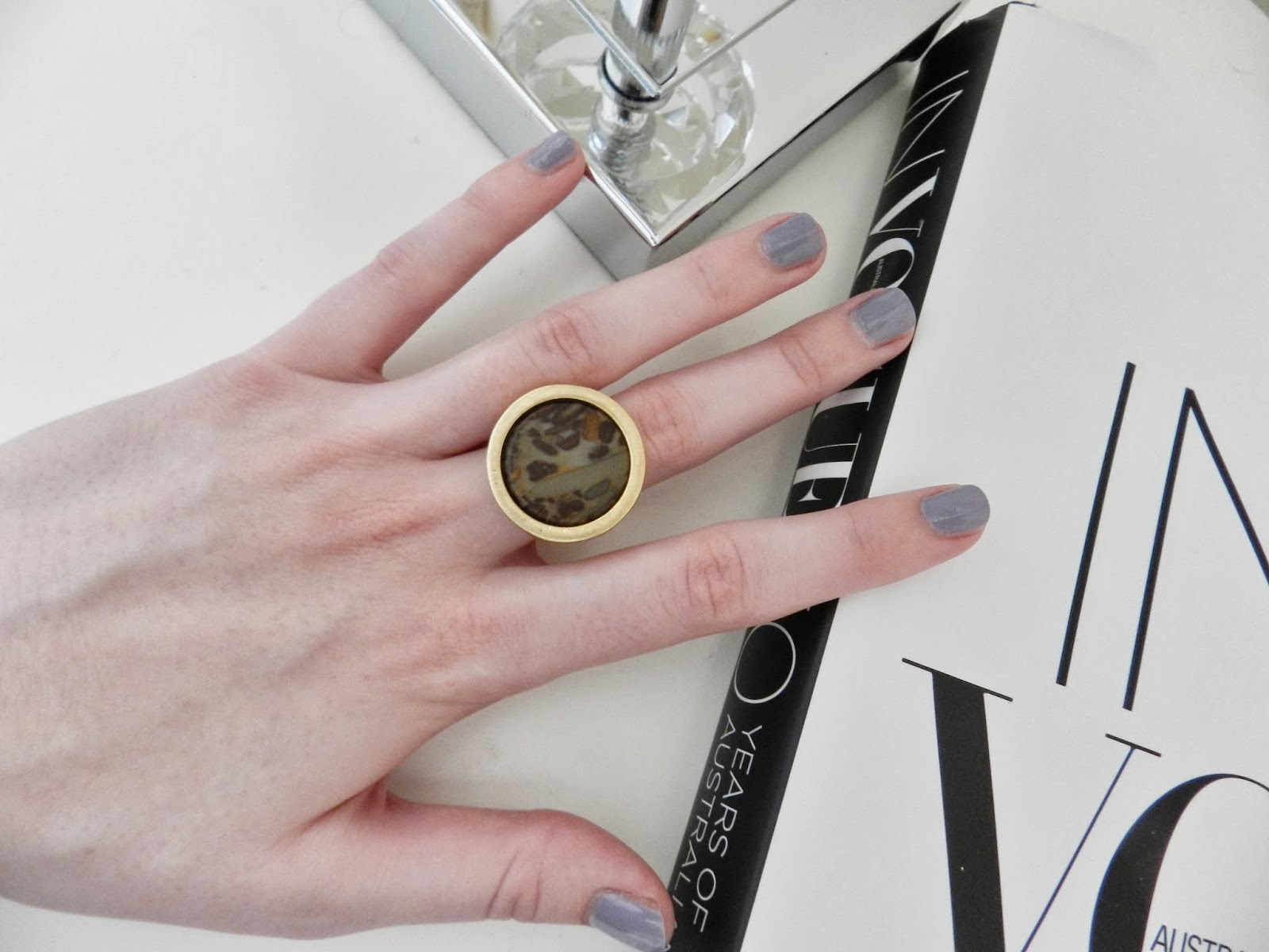 In today's NOTD I'm featuring Bangle Jangle by Essie with Seche Vite being the top coat. Now this colour by Essie is a favourite of mine. It's a sort of pastel lavender with a hint of grey taupe and I think it's a rather chic, understated colour. I'm also wearing my Oroton Qing ring.